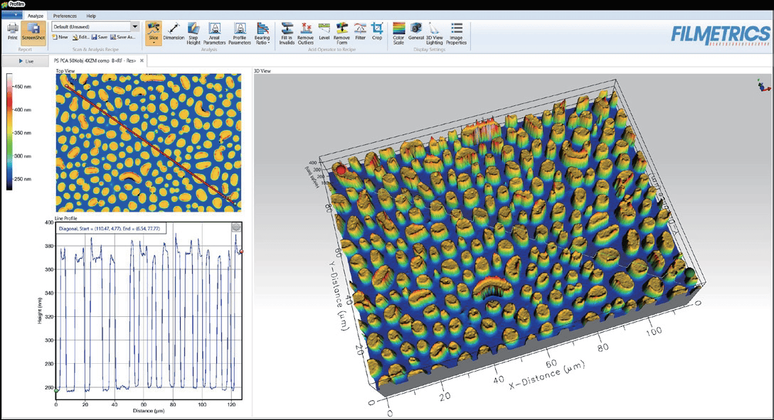 ?測量簡單:?Profilm3D光學(xué)輪廓儀軟件能直觀的反應(yīng)包括表面粗糙度,形狀和臺階高度的測量。在數(shù)秒內(nèi),您可以獲得平面和曲面表面上測量所有常見的粗糙度參數(shù)。也可以選擇拼接功能軟件升級來組合多個影像以提供大面積測量。